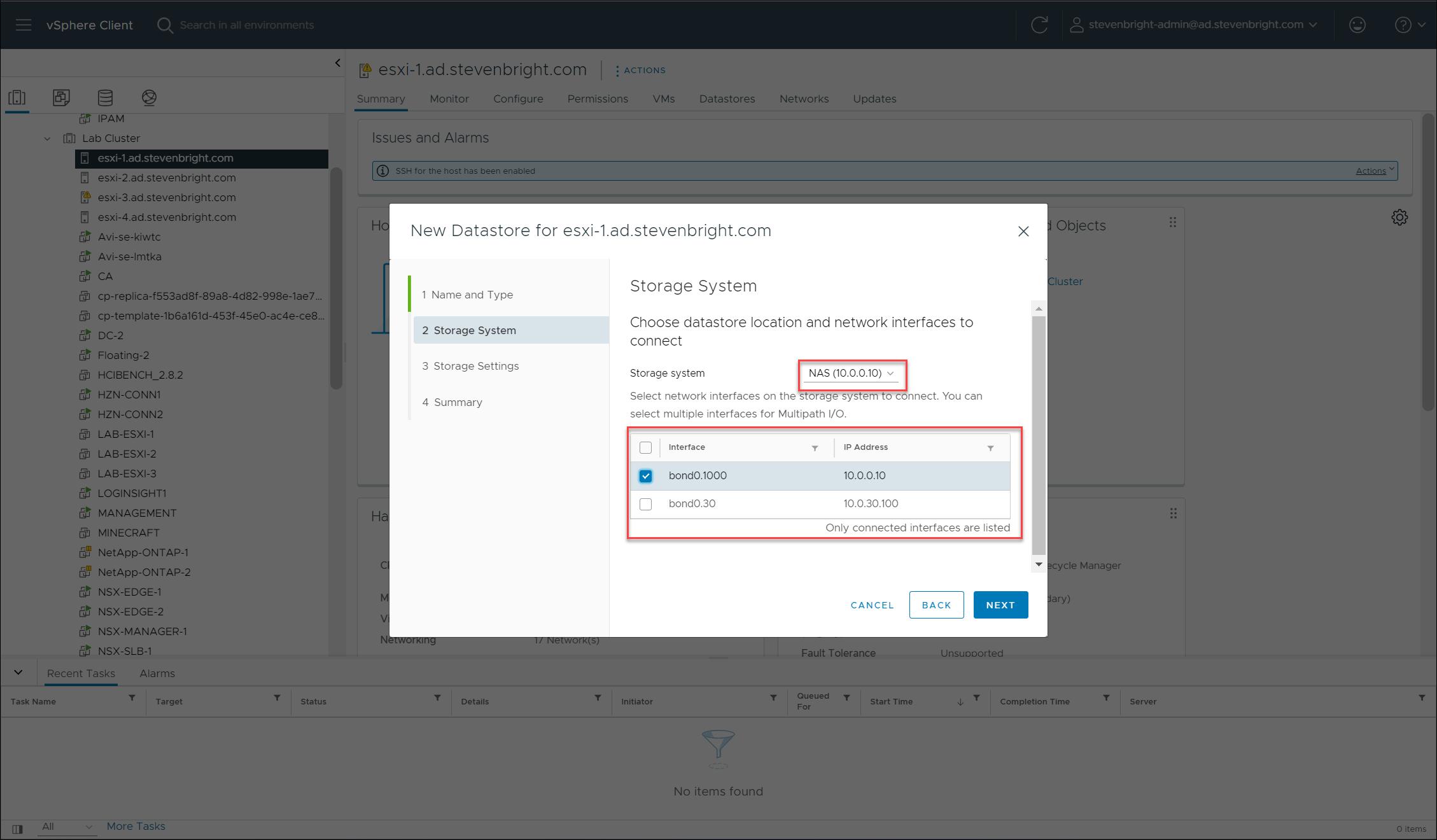 The next step in the wizard allows you to select the Synology storage system on which the new datastore will be created. After selecting your desired storage system, you are presented with a list of network interfaces on the Synology storage system. Select which interfaces should be utilized. In the case of iSCSI, you can select multiple network interfaces to configure multipathing. Click the NEXT button to continue.