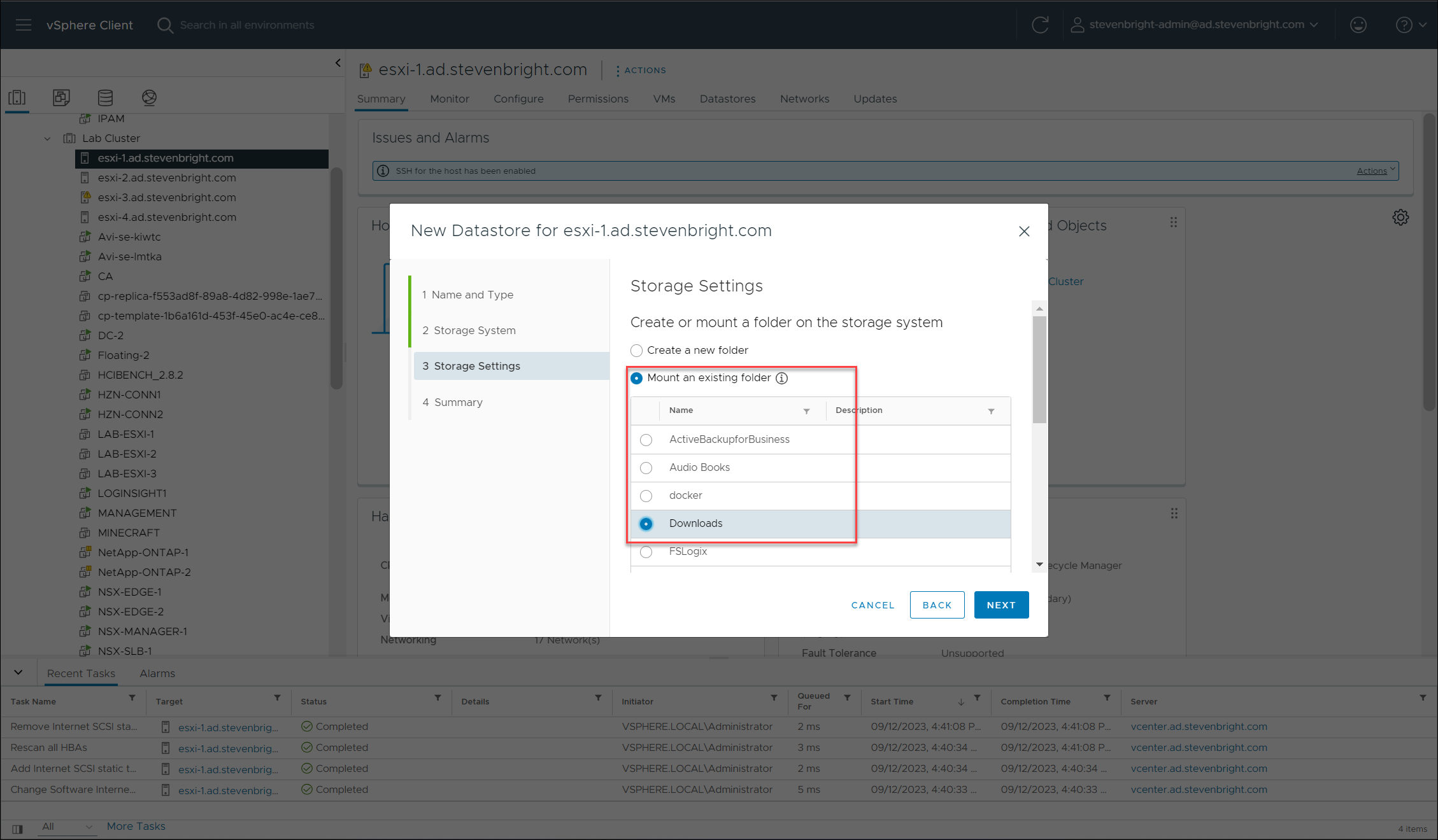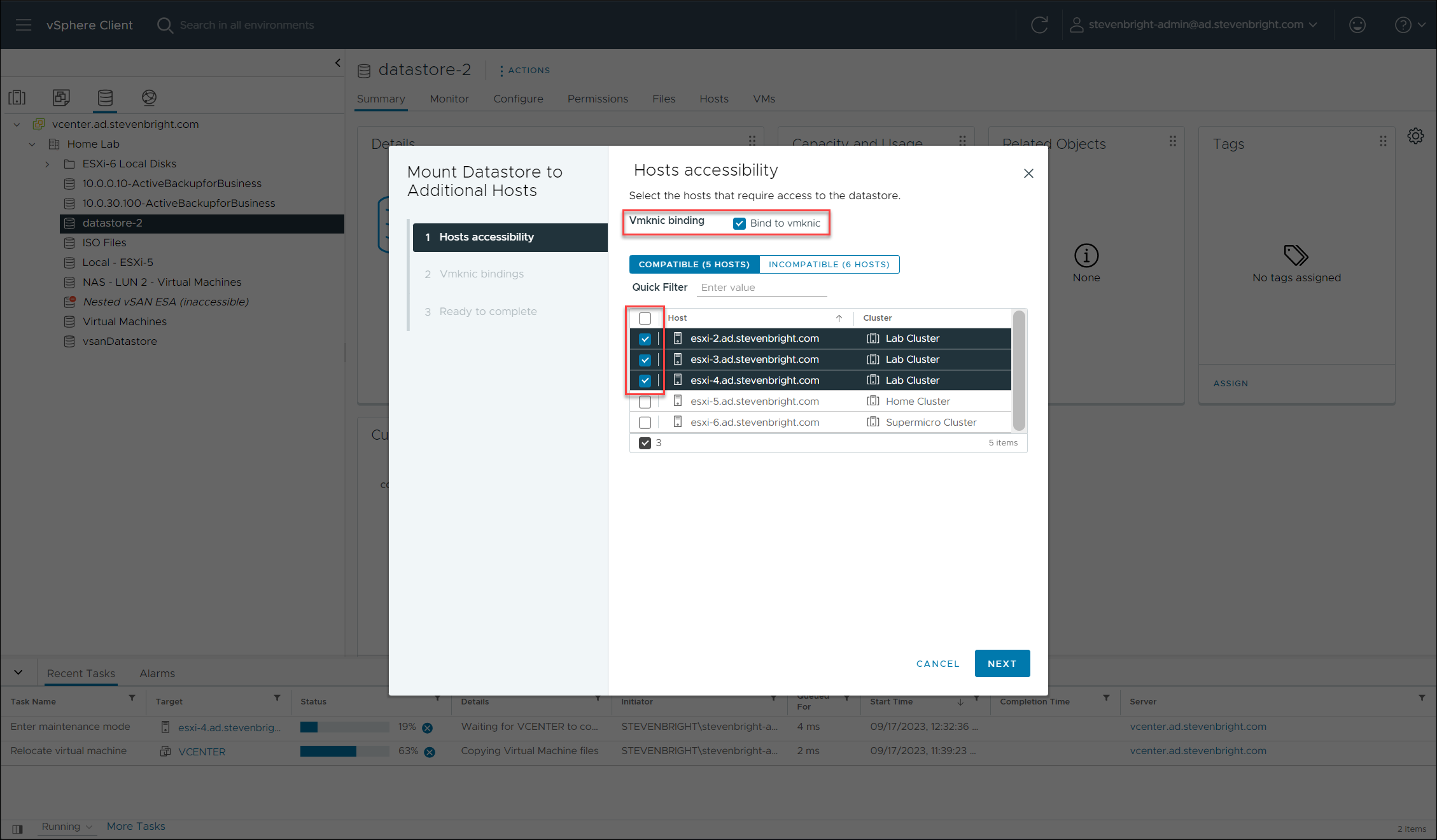 The Mount Datastore to Additional Hosts wizard will launch. The first screen of the wizard requests that we specify the additional VMware ESXi hosts that the NFS volume should be mounted to. If you are using vSphere 8.0 Update 1, you will also have the option of specifying that you wish to bind the NFS volume to a specific vmknic. In my example, I will be mounting the volume to three additional hosts and will be binding it to a specific vmknic. After selecting the desired hosts and options, click NEXT to continue to the next screen in the wizard.