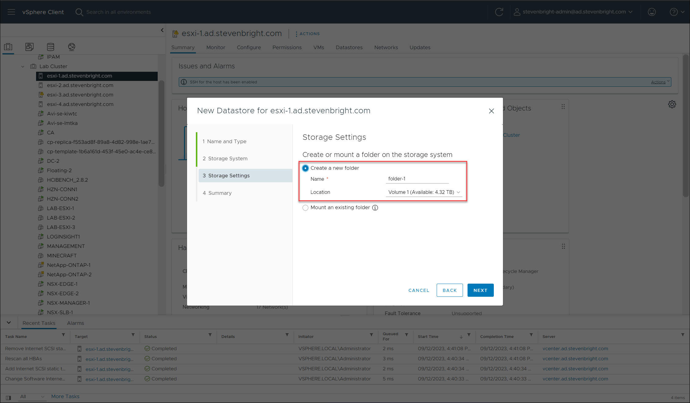 If you are instead creating a new NFS datastore, the wizard prompts you to decide if a new folder should be made or if an existing folder should be used. If you select the new folder option, you are prompted to provide a name for the new folder created on the Synology storage system and the volume.