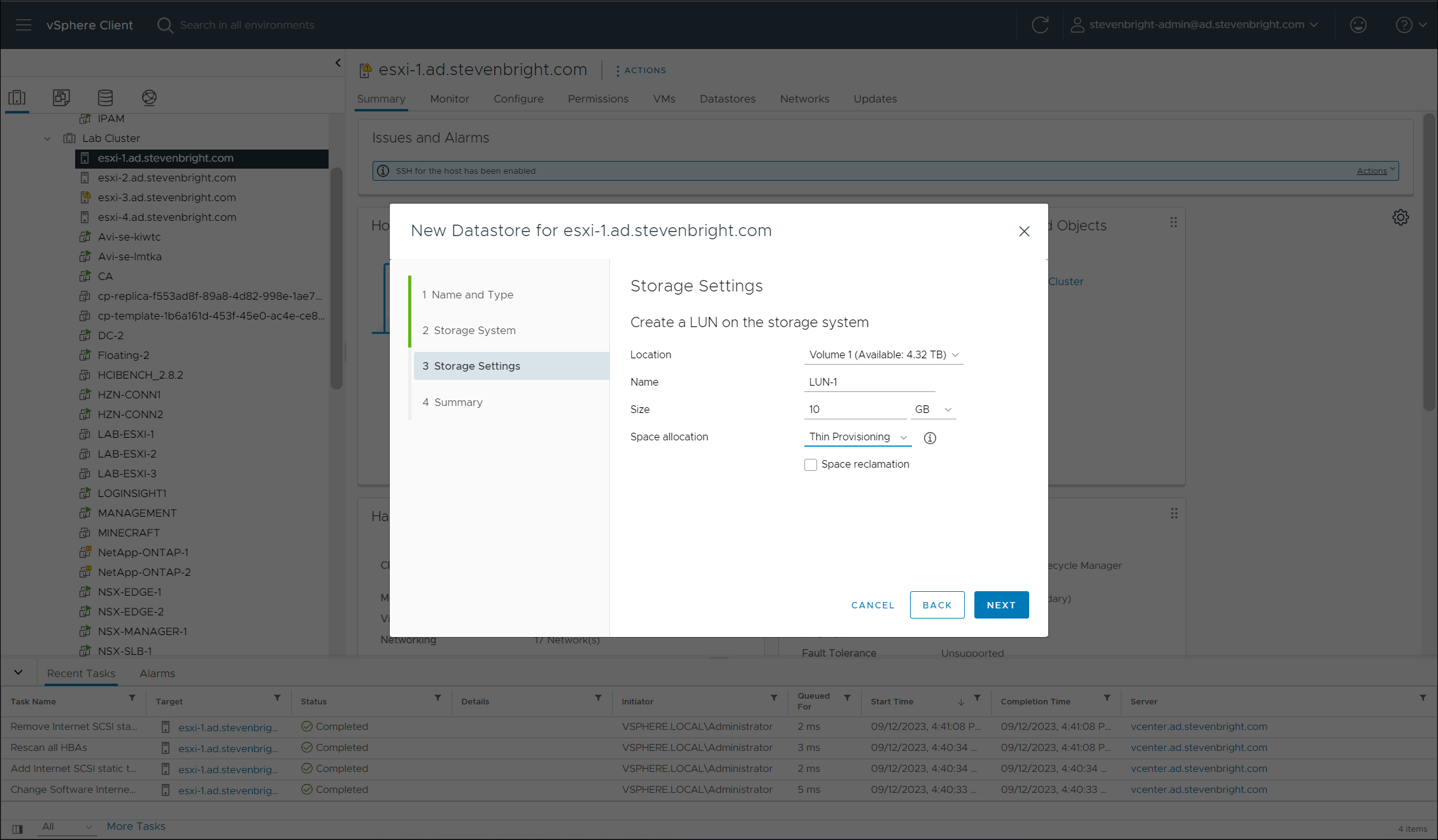 With a new iSCSI LUN, the wizard will create a new LUN and iSCSI Target on your Synology storage system. It will configure the iSCSI target with network bindings based on your selections during the creation process and will configure the target to allow multiple sessions. Unfortunately, iSCSI CHAP settings are not included in the configuration and must be configured manually. Additionally, the iSCSI storage device is added to the VMware ESXi host using the multipathing policy of Most Recent Used instead of the preferred Round Robin policy.