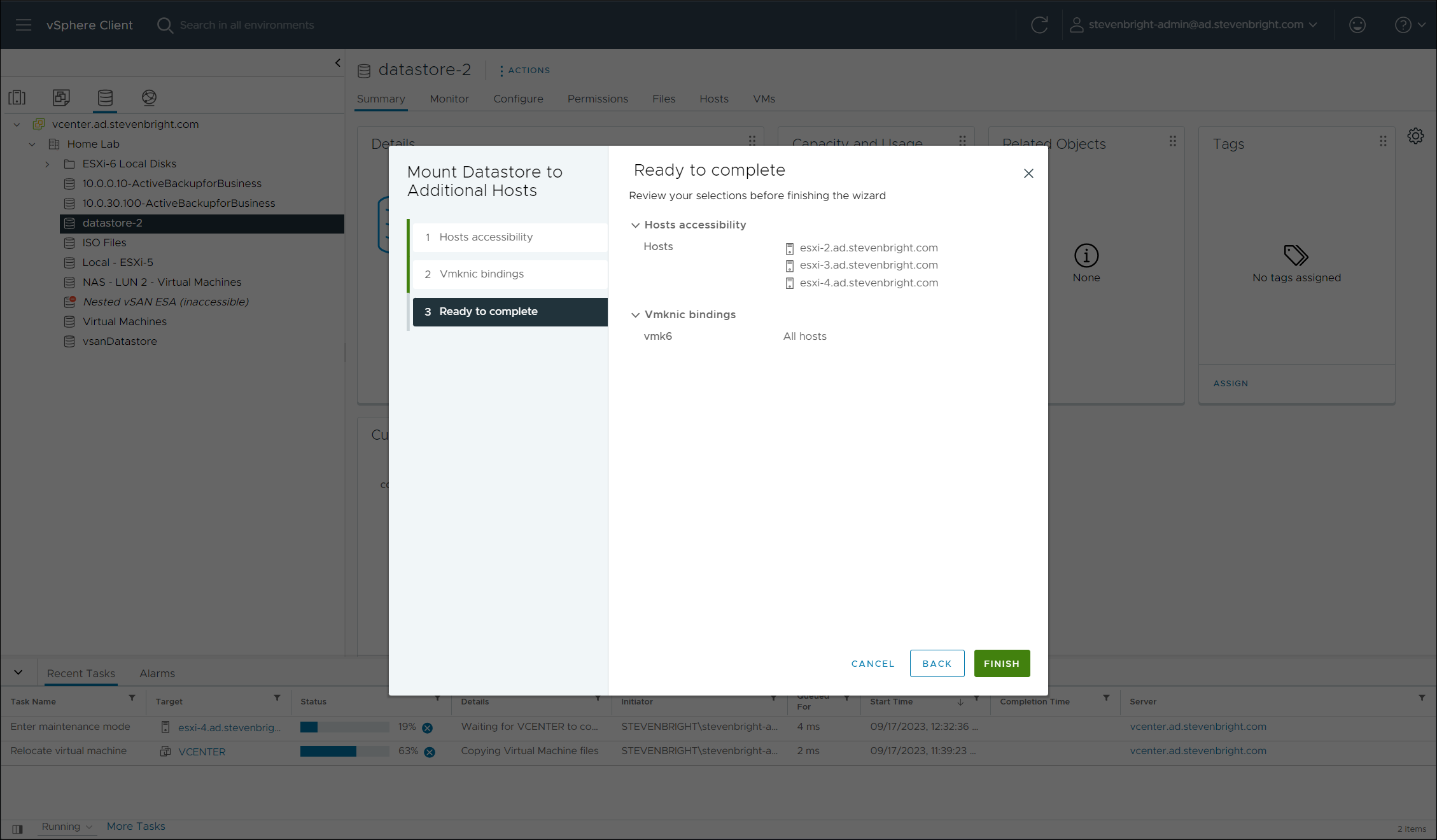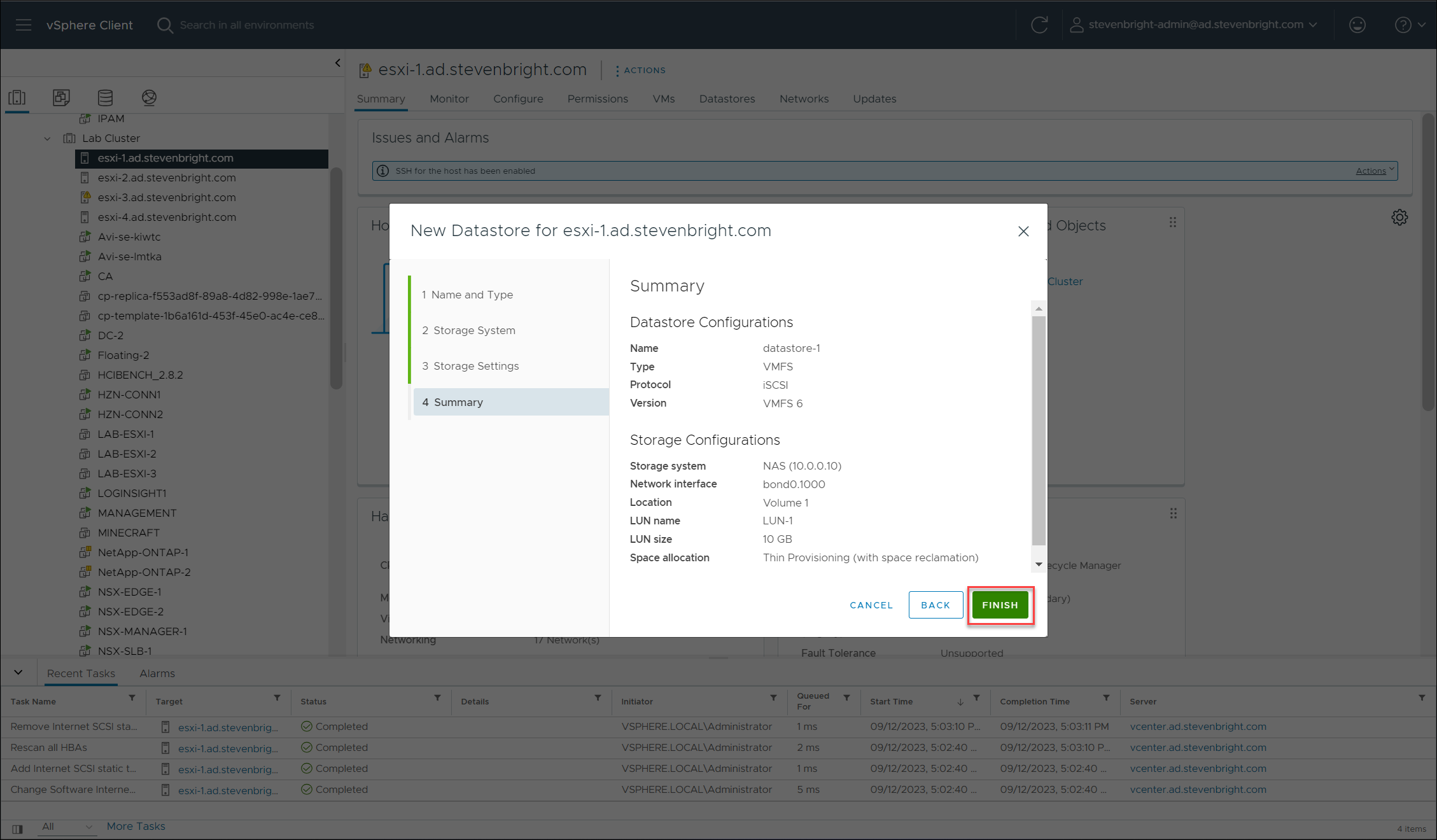 After clicking NEXT, the wizard gives you a summary of your chosen configuration options. Click the FINISH button to begin creating the new datastore.