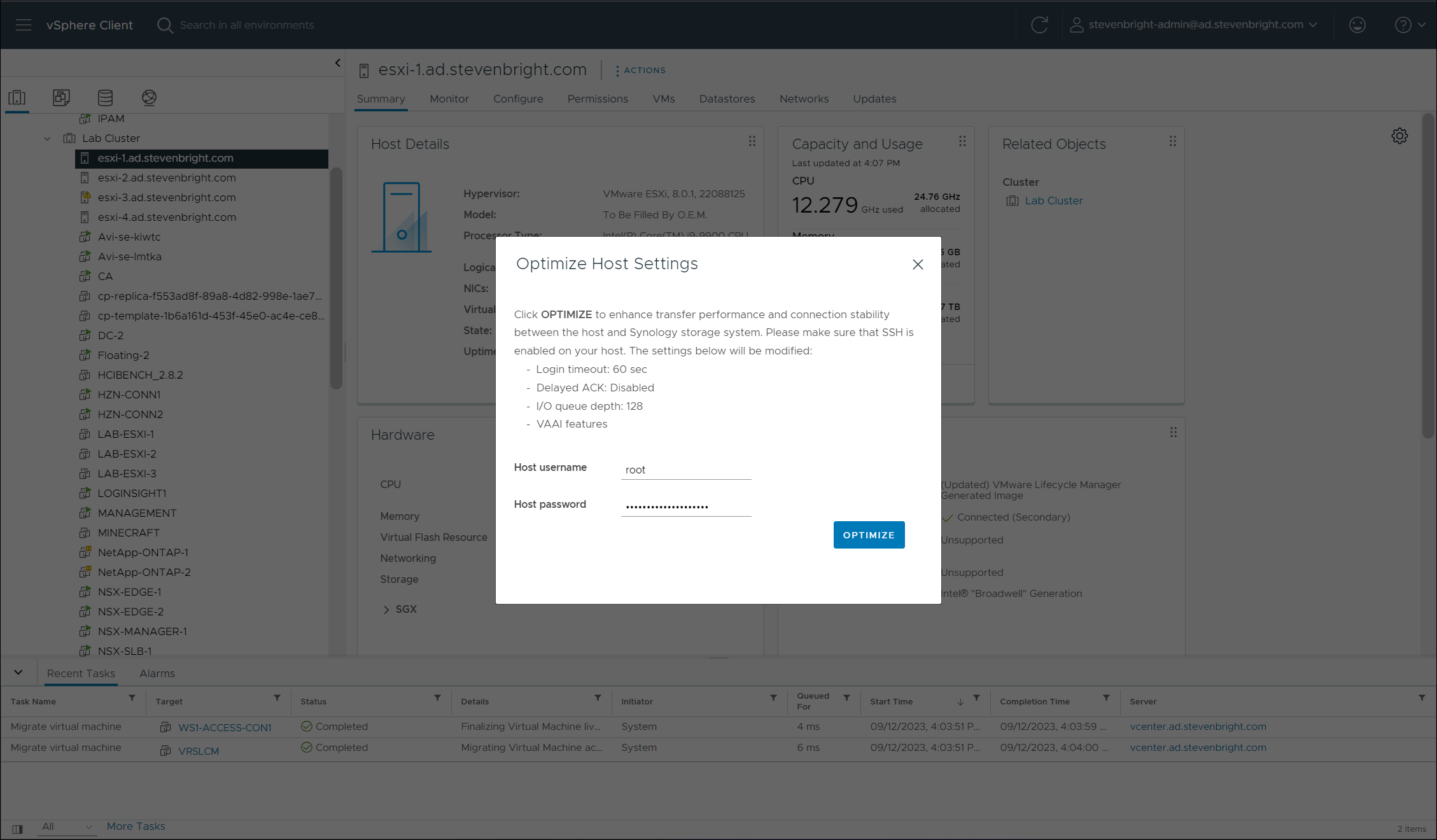 One of the first tasks you might want to complete after integrating the Synology Storage Console for VMware into your vSphere environment is to optime your VMware ESXi hosts’ iSCSI storage adapters for optimal performance and stability when connecting to your Synology storage system. Host optimization is a simple task that is executed on individual VMware ESXi hosts. This action implements the following settings on your iSCSI storage adapter/Synology iSCSI LUNs: