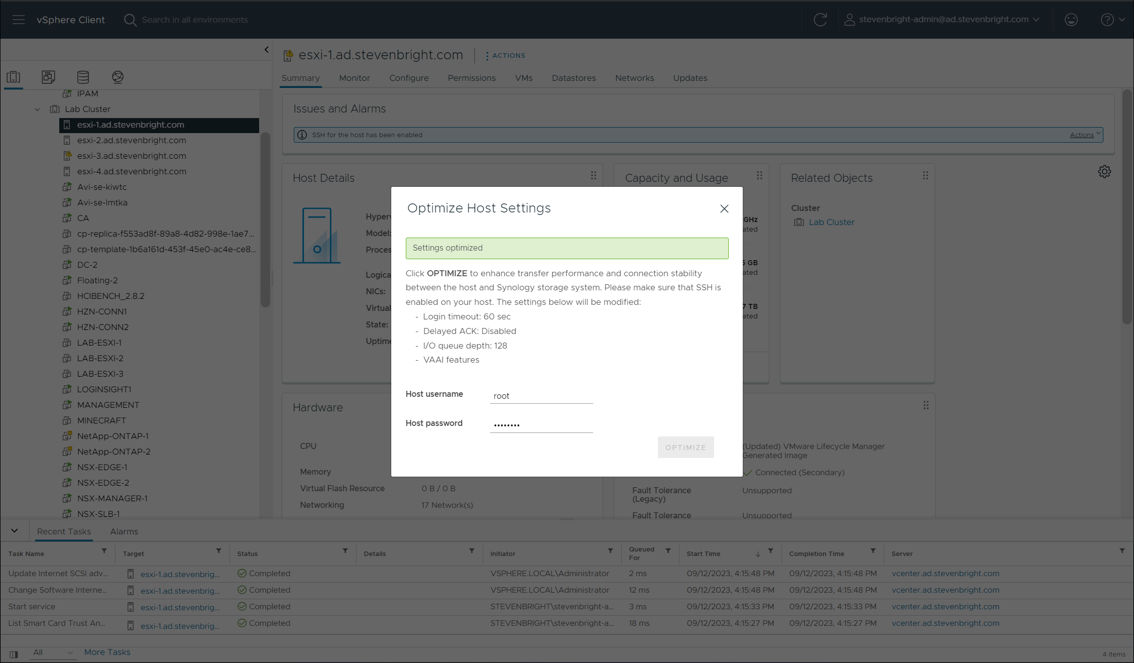 After clicking the OPTIMIZE button, a progress circle will spin on the display, indicating that the action is executing. If successful, you are provided a notification at the top of the dialog that states, “Settings Optimized.” Click on the X at the top right corner of the dialog to close it. Don’t forget to enable Lockdown Mode on the host and stop the SSH service. Repeat these steps for each additional host connected to your Synology system via iSCSI.