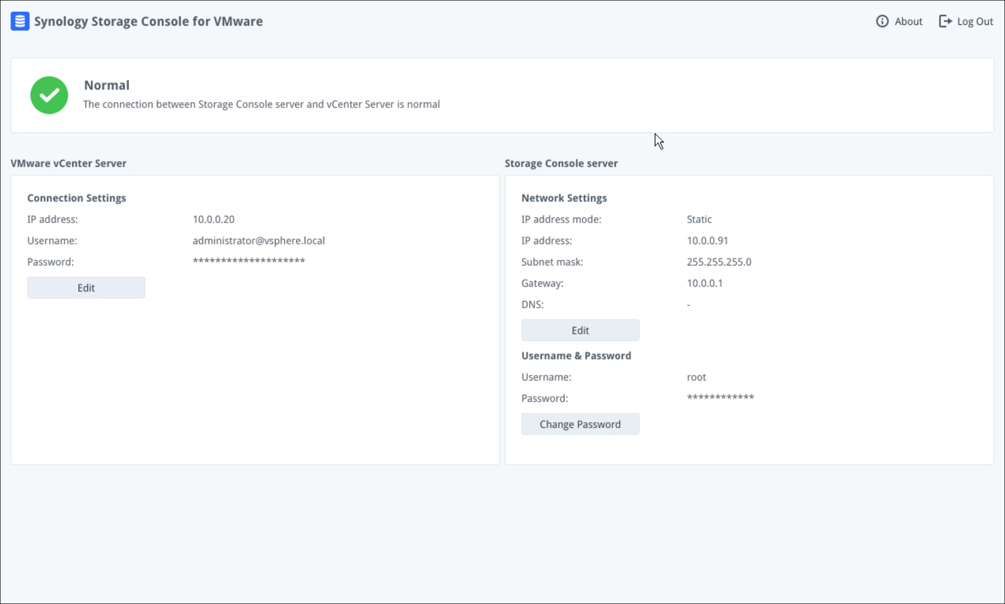 The virtual machine hosting the Synology Storage Console for VMware provides a UI that allows you to reconfigure the network settings, reconfigure the vCenter Server settings, including the username/password, and update the root user account password. The default credentials for accessing this UI are: