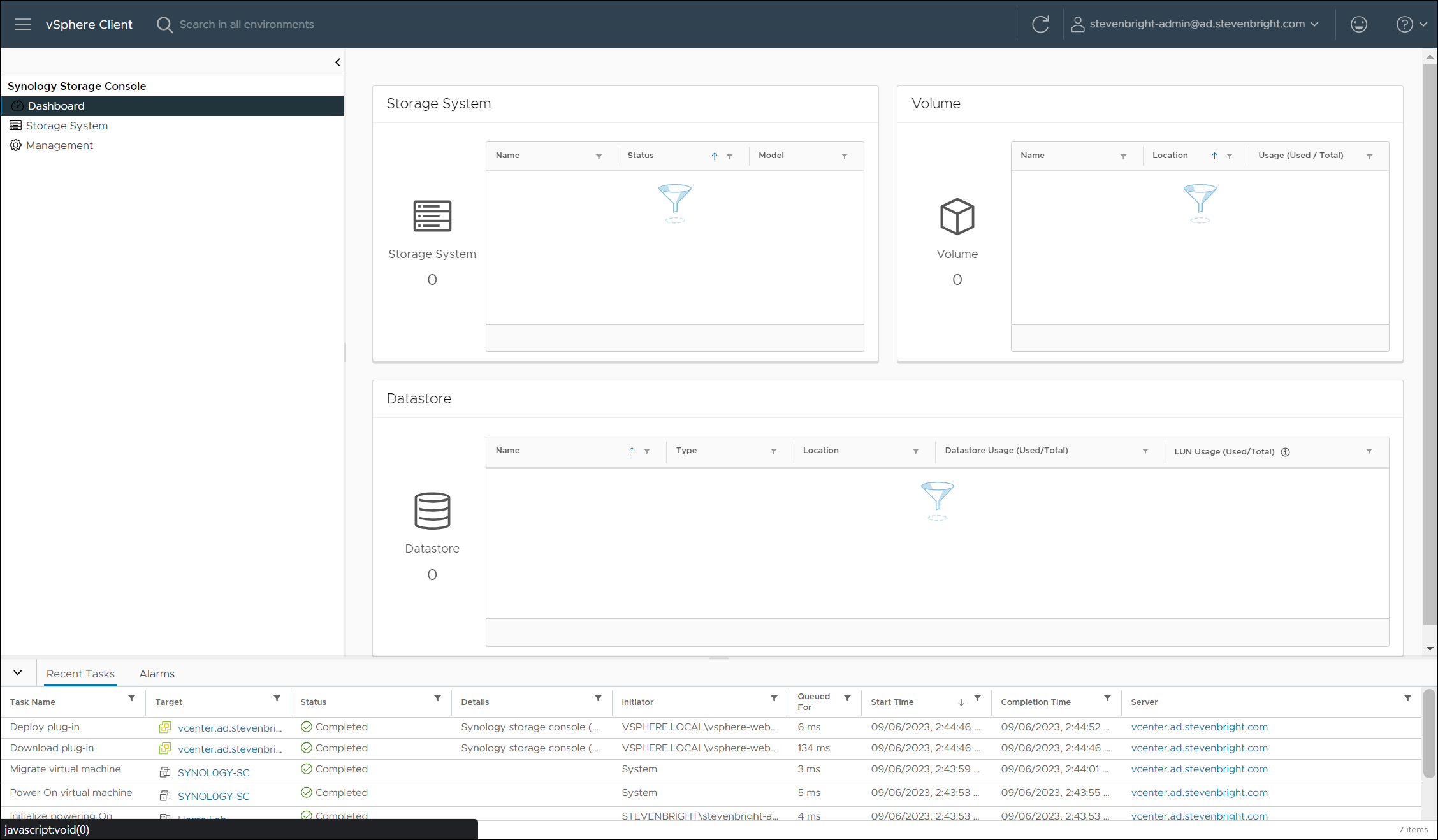The empty dashboard for the Synology Storage Console for VMware will greet you.