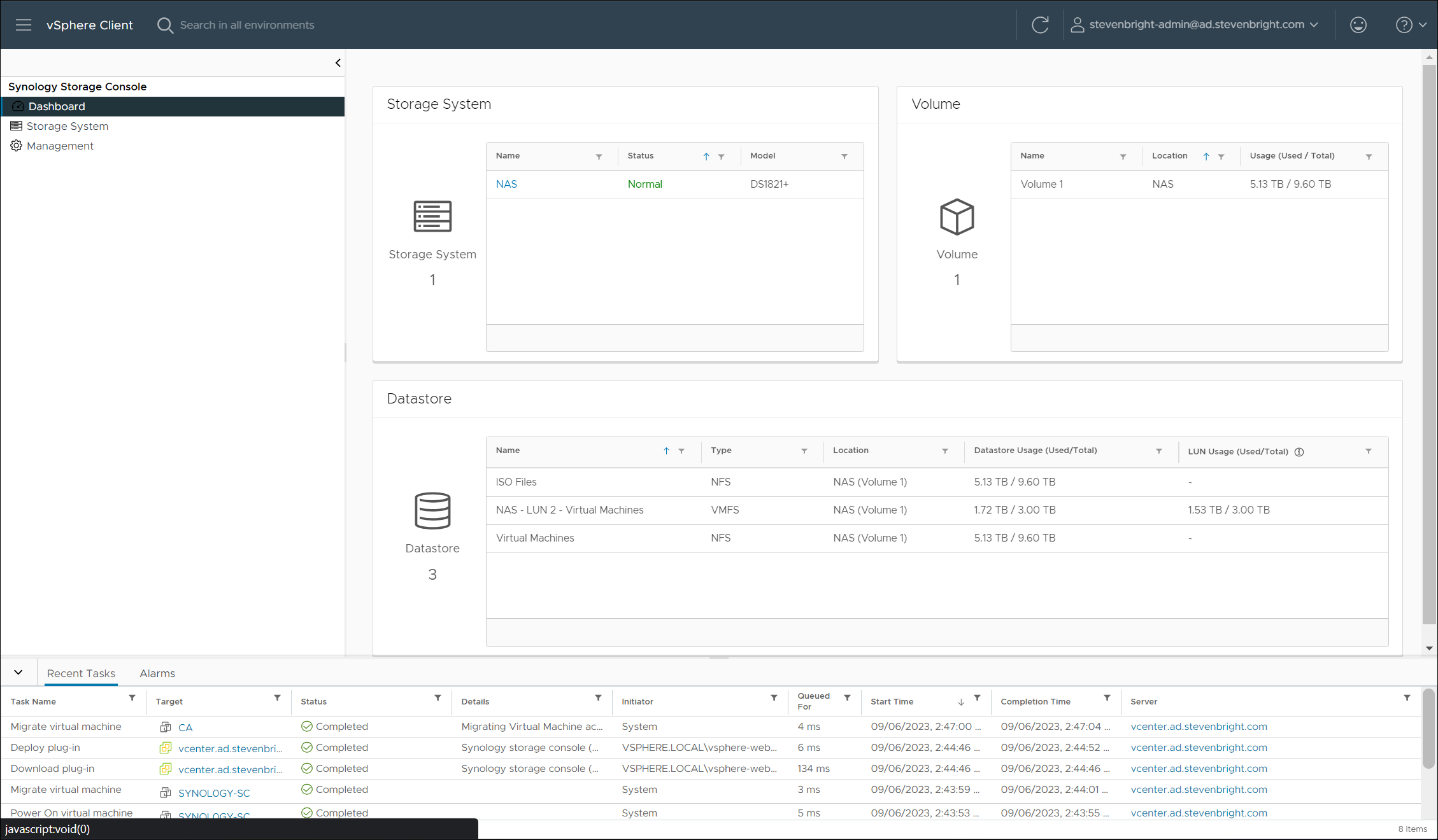 The Synology Storage Console for VMware provides the VMware vSphere administrator with easy access to complete everyday storage-related tasks when using Synology storage in a VMware environment. However, the Storage Console does not always utilize the best configuration options when configuring new storage. This is evident in the way it configures NFS mounts to allow any IP address access to the mount and does not utilize Round Robin multipathing for iSCSI LUNs. Additionally, creating a new iSCSI Target for each LUN created can make for a messy configuration. Finally, it should also be noted that the plug-in utilizes a deprecated local plug-in architect. It has not been updated to use the new web plug-in architecture or to be stylized to blend in with the current vSphere Client.