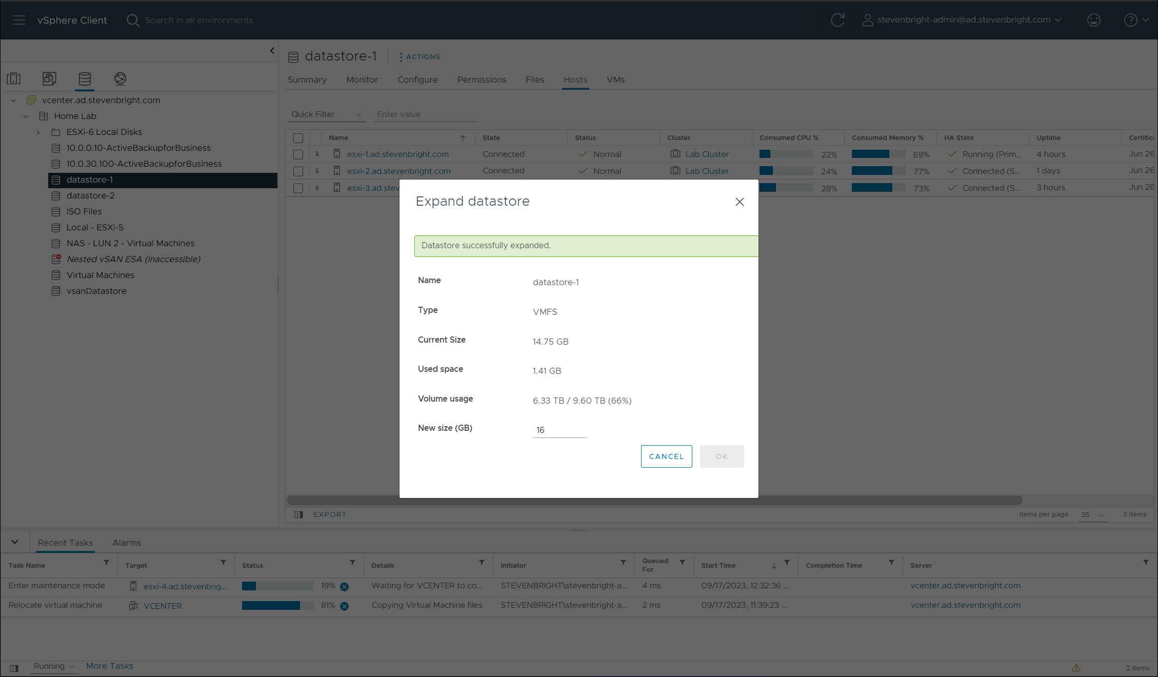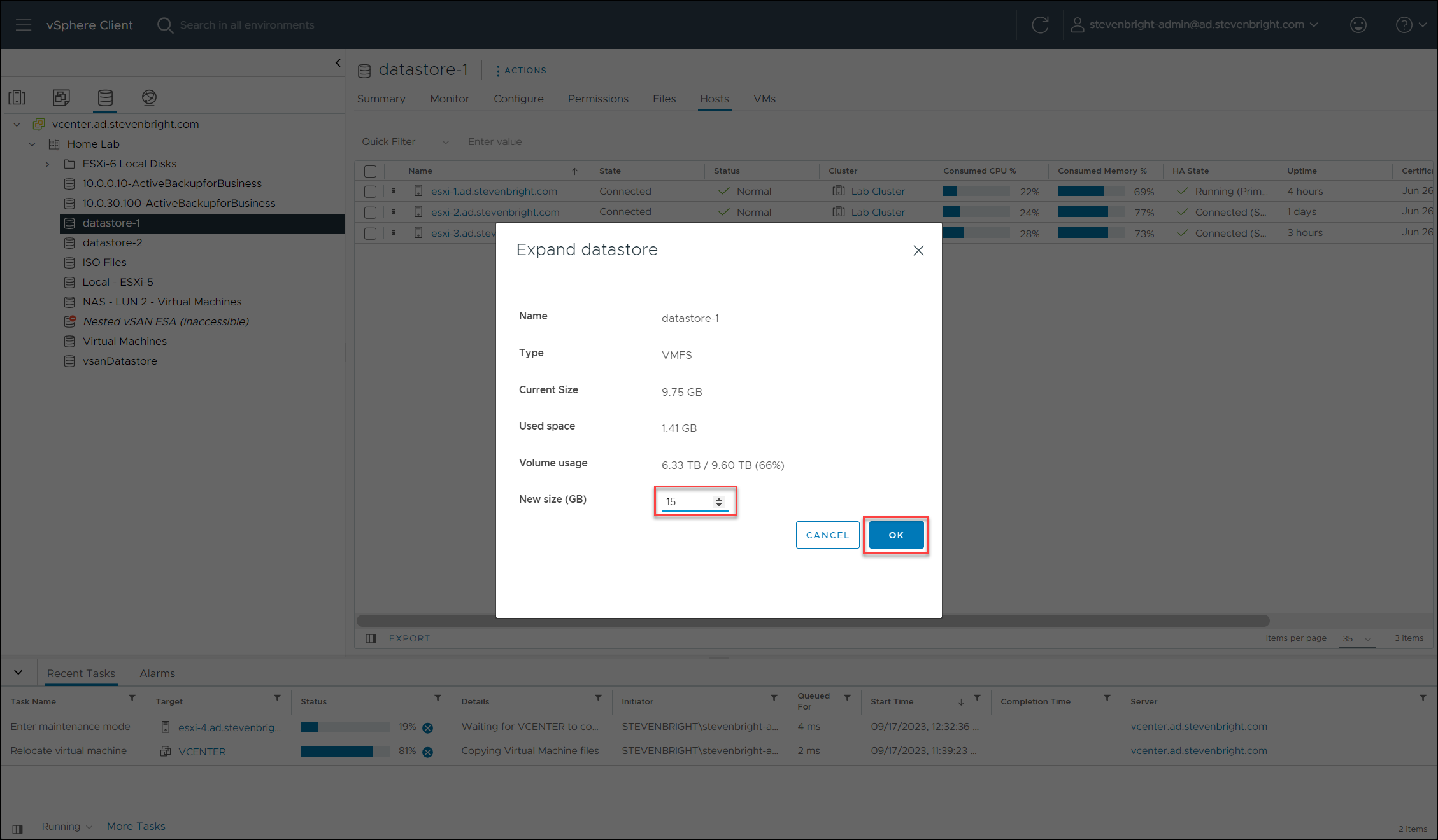 The Expand datastore dialog launches with a simple one step process for expanding the datastore. The dialog will display the details for the existing iSCSI LUN and provides a text box for entering a new size. Provide the new size in GBs and click the OK button to resize the iSCSI LUN.
