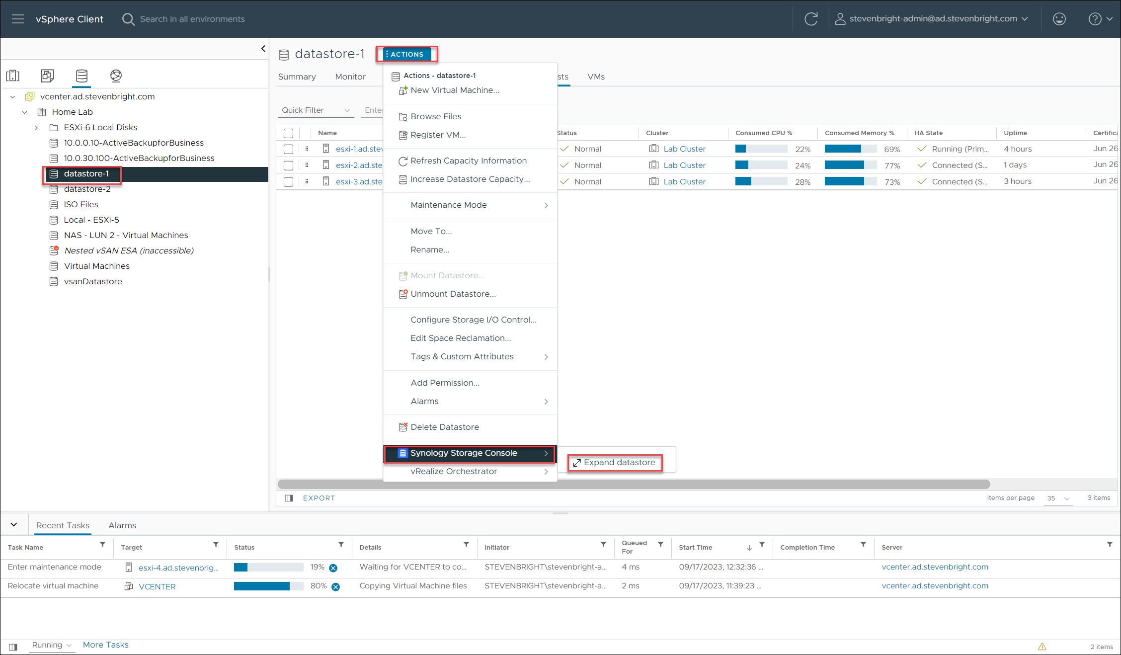 Now that we have created our iSCSI LUNs, NFS datastores, and have mounted them to all of our VMware ESXi hosts, we might find that our iSCSI LUNs are running out of space and need to be expanded. Luckily, the Synology Storage Console for VMware makes this task quite easy to accomplish from within the VMware vSphere Client. Note that this process does not apply to NFS volumes as they can take advantage of all available disk space on the Synology storage volume by the nature of NFS being a folder on the NAS. To get started with resizing our iSCSI LUN, select the datastore from the VMware vSphere Client inventory, select the ACTIONS menu, select Synology Storage Console , and choose Expand datastore.