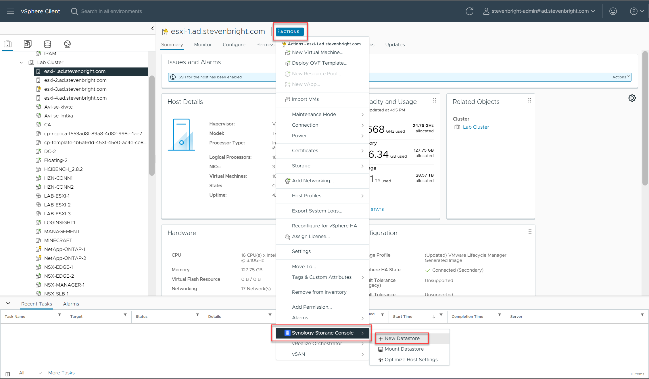To start the process, select an VMware ESXi host from your inventory in the VMware vSphere Client, click the ACTIONS menu, select the Synology Storage Console option in the menu, and then select New Datastore.