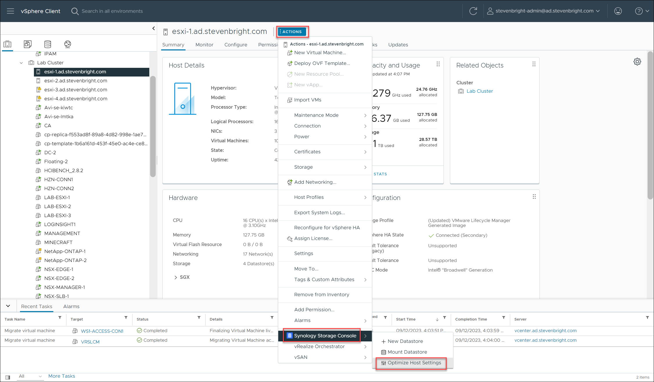 The only requirement for this operation is that the Synology Storage Console for VMware can open an SSH connection to our VMware ESXi host. With that requirement in mind, the first step is to enable the SSH service on the VMware ESXi host and disable Lockdown Mode. Next, from the ACTIONS menu for the VMware ESXi hosts, select the Synology Storage Console menu, then select the Optimize Host Settings option.
