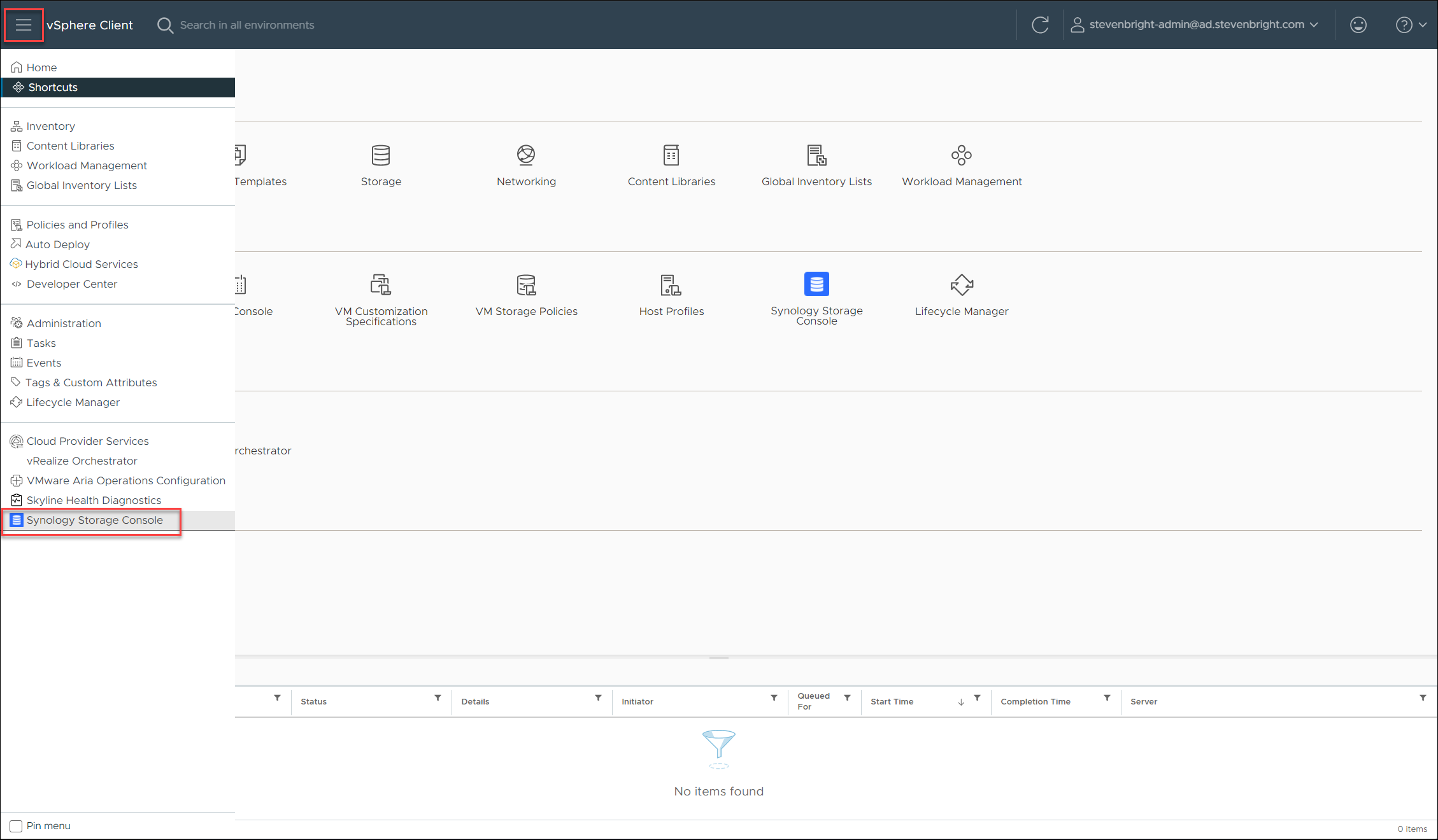The first step after successfully deploying the Synology Storage Console for VMware is to add your Synology storage system to the plug-in for management. To accomplish this, select the menu icon at the top left of the VMware vSphere Client to bring up the list of available shortcuts, then select the Synology Storage Console.