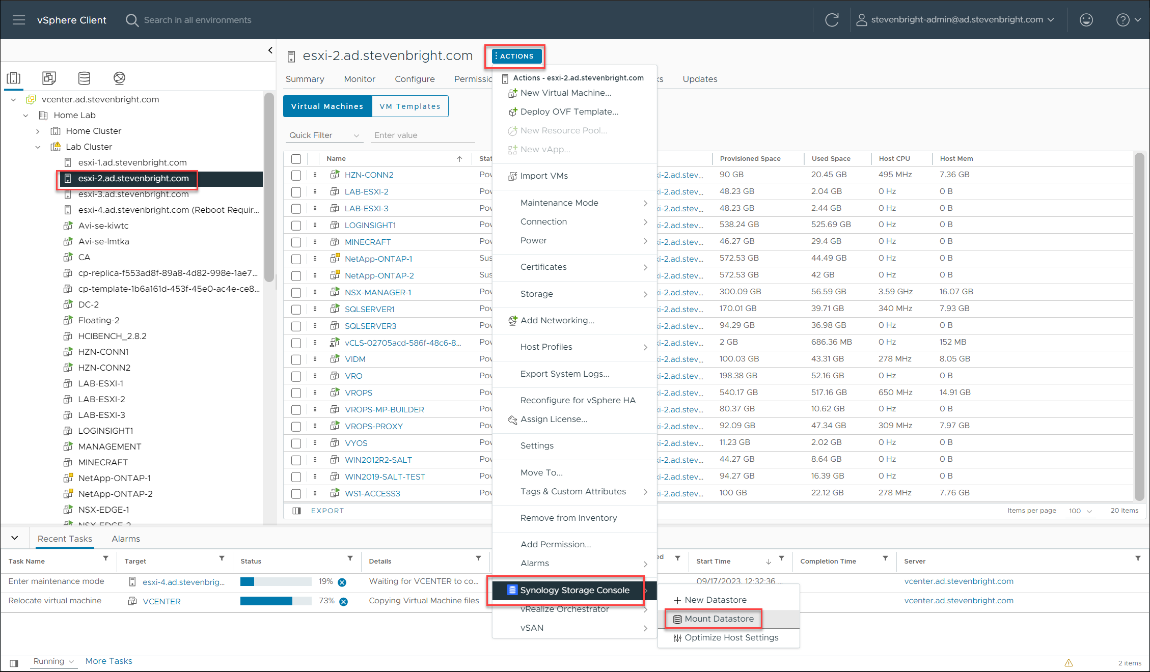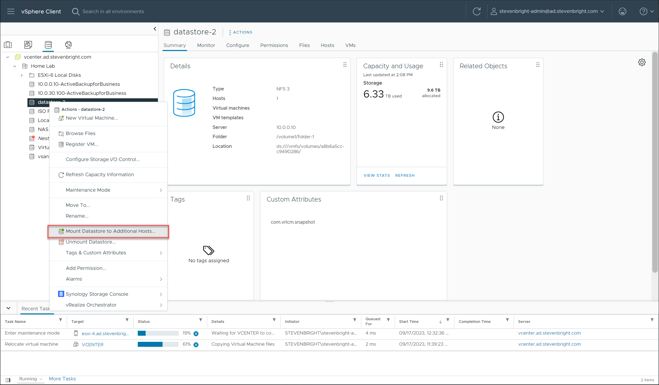 Synology provides an alternate means of mounting an existing NFS volume to additional hosts. This process starts by selecting an existing VMware ESXi host within the VMware vSphere Client inventory, selecting the ACTIONS menu, selecting Synology Storage Console , and choosing Mount Datastore.
