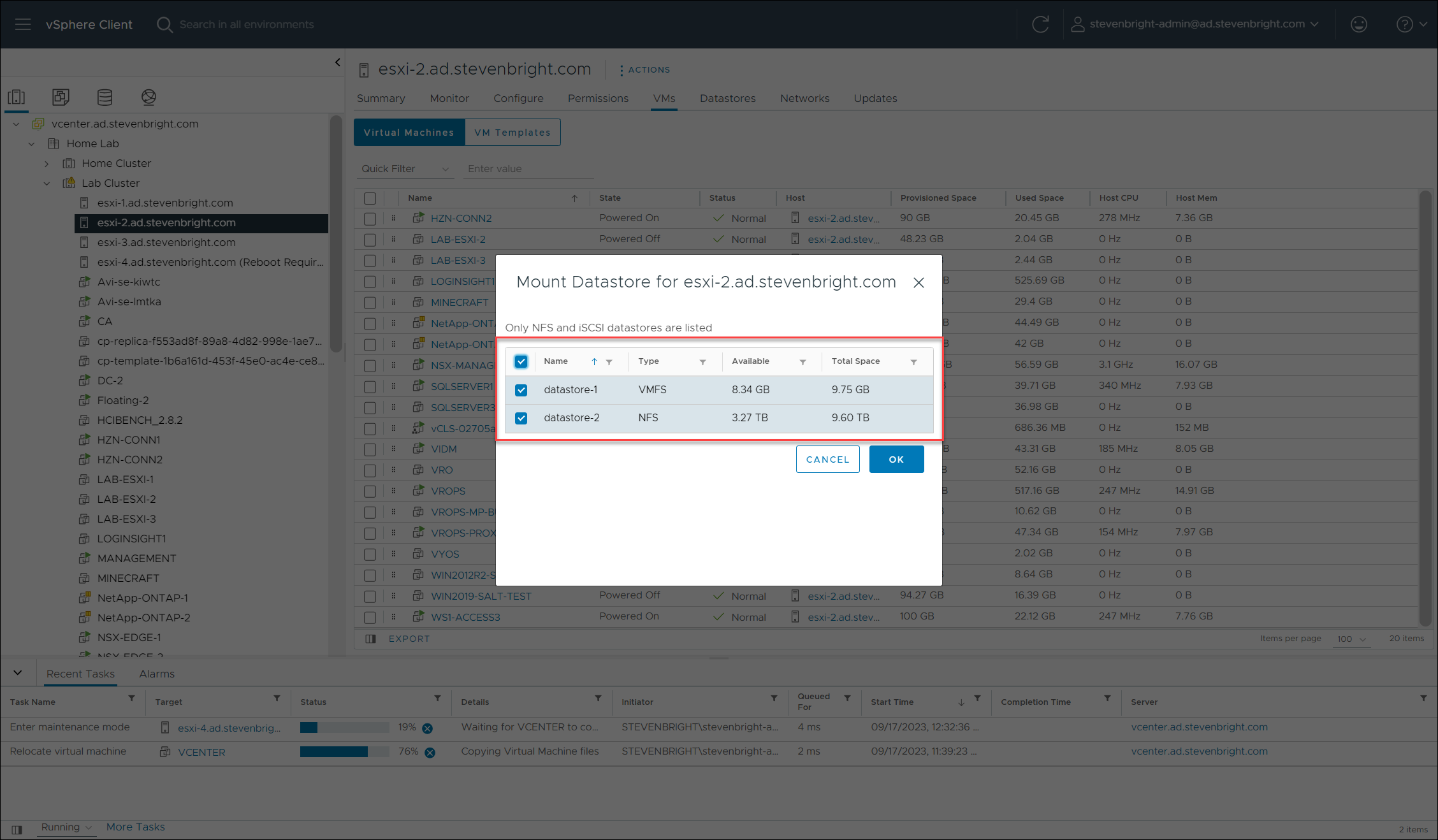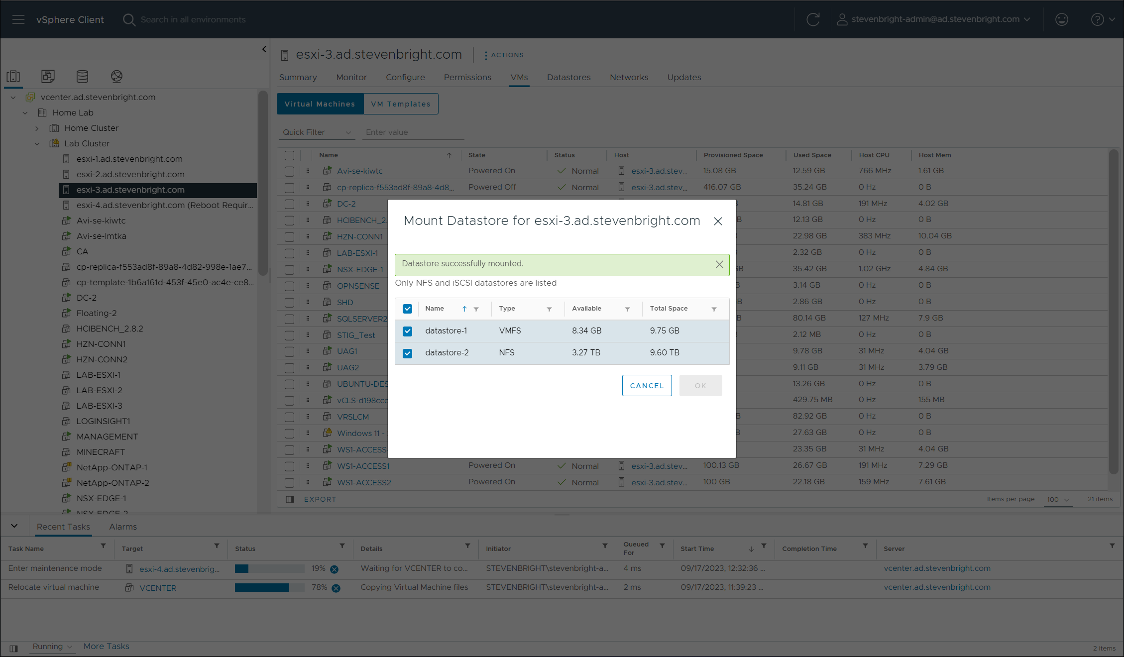 Select the desired datastores you wish to mount to the VMware ESXi hosts, then click the OK button to mount the datastores to the VMware ESXi host. A spinning icon will appear at the top of the dialog, indicating that work is being completed. If successful, a green banner will display at the top of the dialog stating that the datastores were successfully mounted.