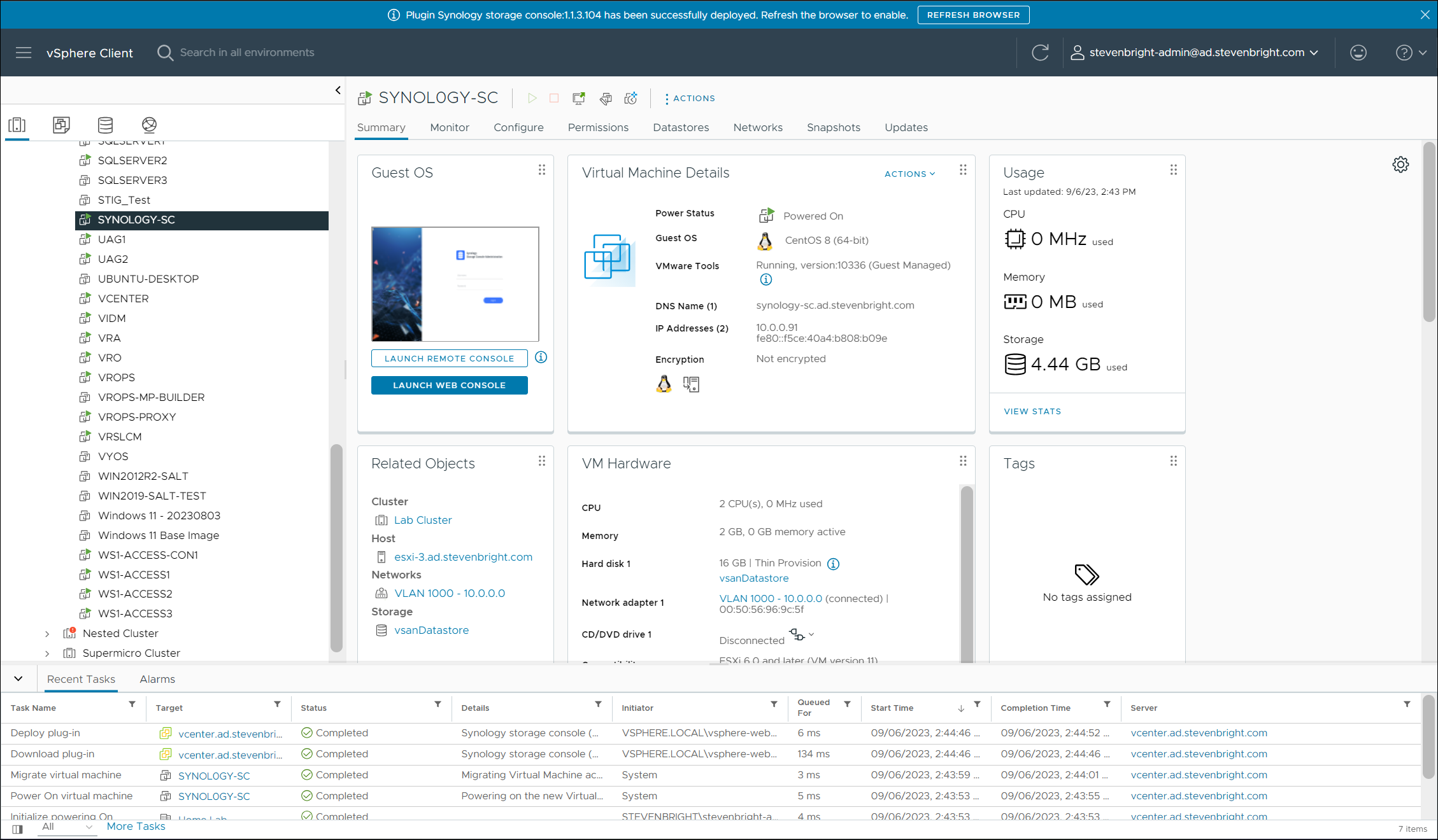 The Synology Storage Console for VMware is a virtual appliance based on CentOS 8 and utilizes the deprecated local plug-in architecture for integration within the VMware vSphere Client. It supports VMware vCenter Server Appliance 6.5 U2 or above and requires Synology DSM version 6.2.3 or above. The virtual appliance requires the following resources: