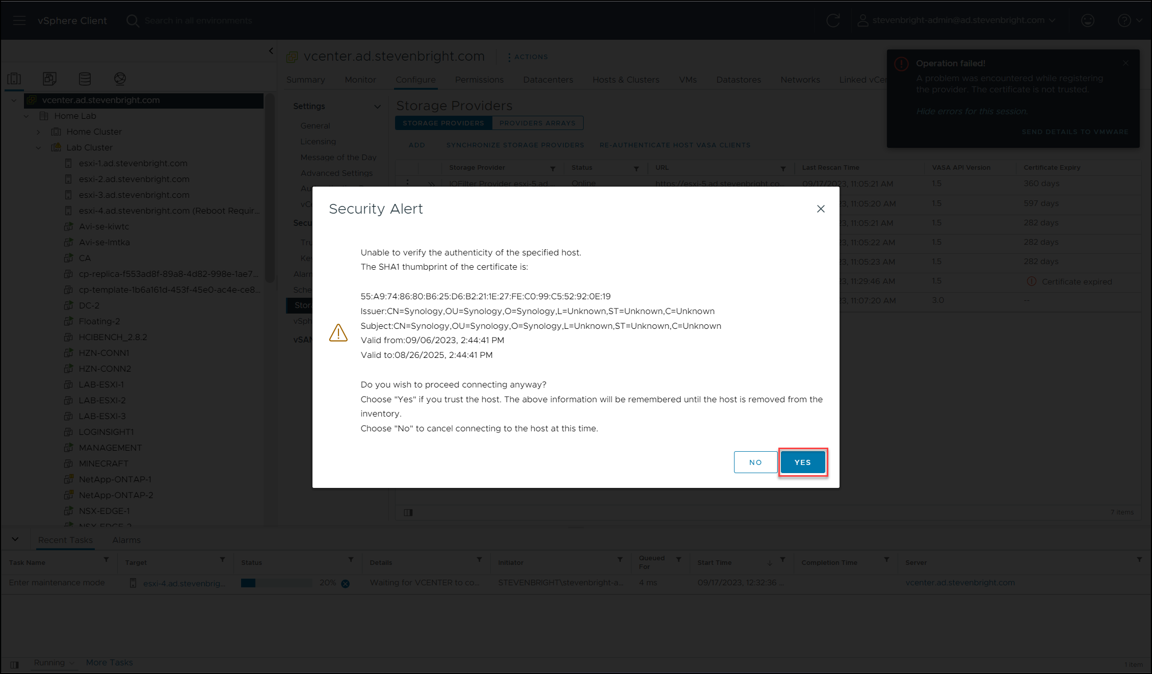 The VMware vSphere Client will provide you with a Security Alert prompt stating that the authenticity of the host can’t be verified. The dialog provides details regarding the certificate provided by the VASA provider. Review the details, then click YES to accept the certificate and complete the addition of the VASA provide.