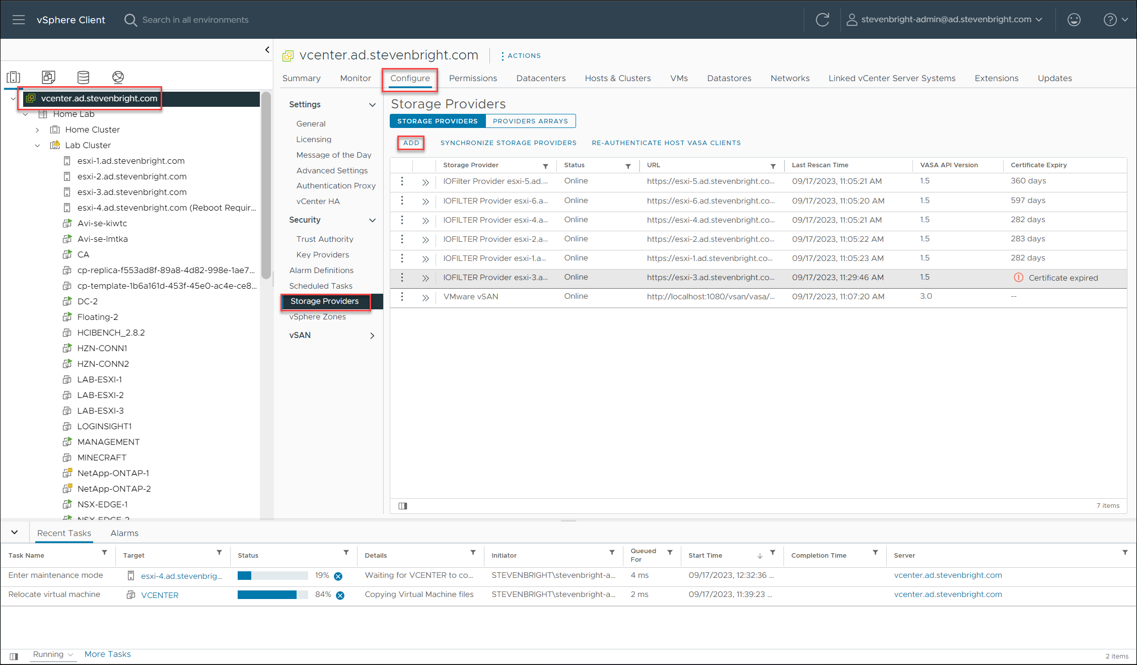 The Synology Storage Console for VMware includes a VMware VASA Provider (VASA 1.0) that provides the VMware vCenter with information regarding the capabilities of the iSCSI LUNs presented to the VMware ESXi hosts. With this knowledge, you can build storage profiles using those characteristics and assign them to VMs based on requirements. To add the VASA provider to the VMware vCenter Server, select the VMware vCenter Server within the VMware vSphere Client, then select the Configure tab. Under the listing of various settings, select Storage Providers. Click the ADD button to begin the process of adding the VASA provider.